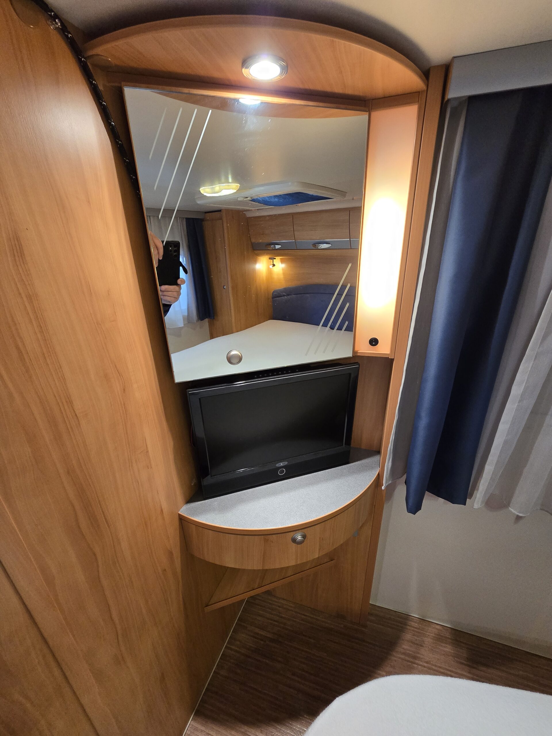 Kijken naar uw favoriete programma’s of luisteren naar heerlijke muziek wordt mogelijk gemaakt door de ingebouwde audio-installatie en de aanwezige televisie. Om via de satelliet televisie te kunnen kijken, is de camper uitgerust met een schotelantenne. Doordat deze camper met een hordeur is uitgerust, heeft u in de camper geen last van insecten. Met de aanwezige zonnepanelen kunt u zelf zonne-energie opvangen en omzetten naar elektriciteit. Het ontbreekt zelfs de veeleisende kampeerder aan niets; de vaste afvalwatertank, de leeslampjes, de buitenlamp, het reservewiel en de trekhaak zijn een kleine greep uit de vele details die deze camper zeer de moeite waard maken.
