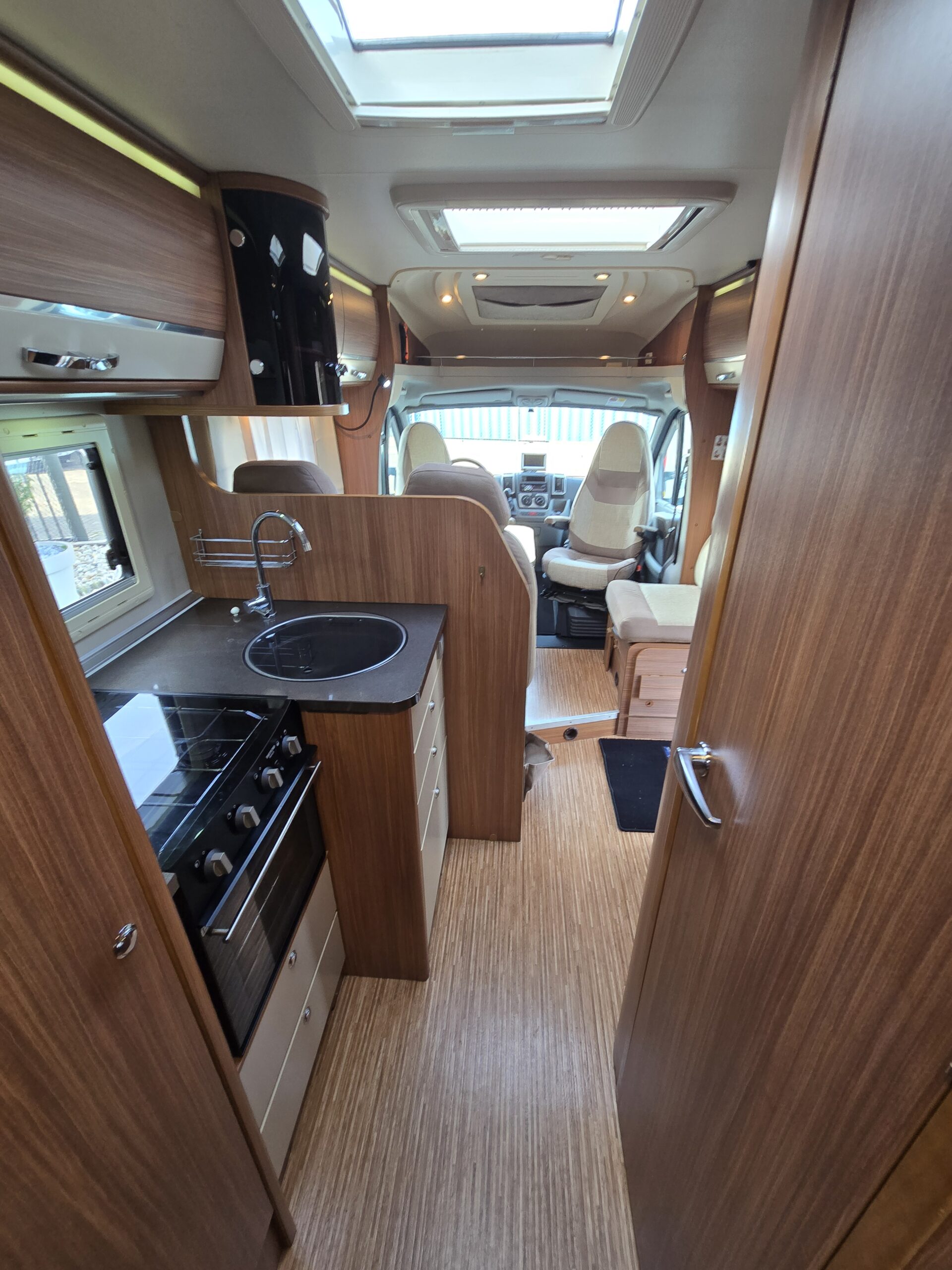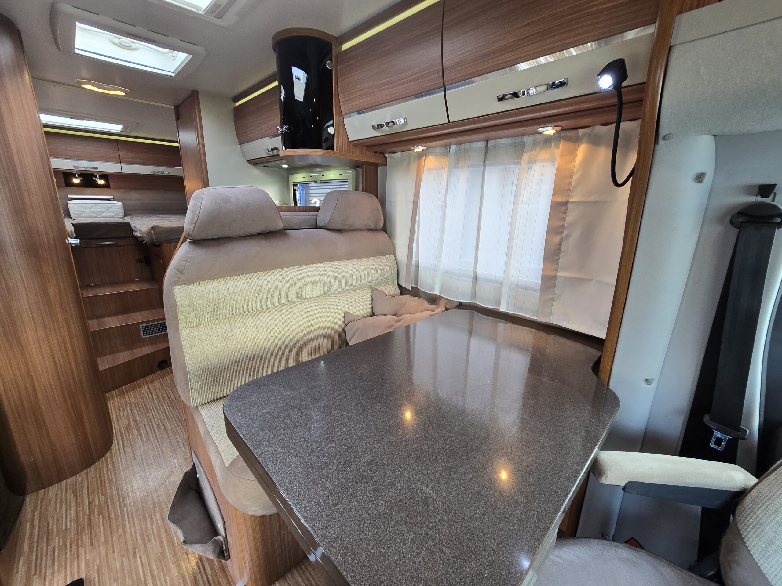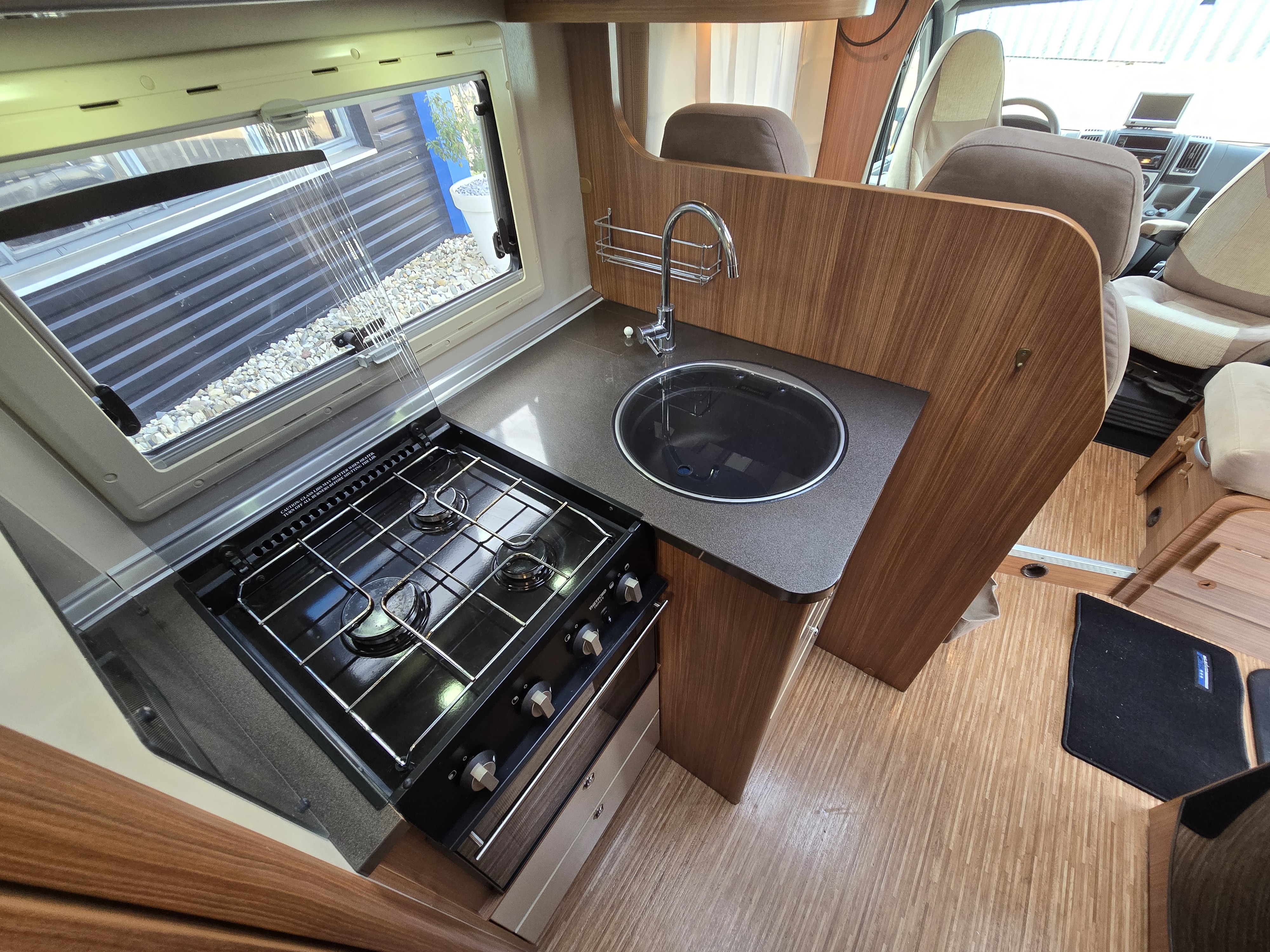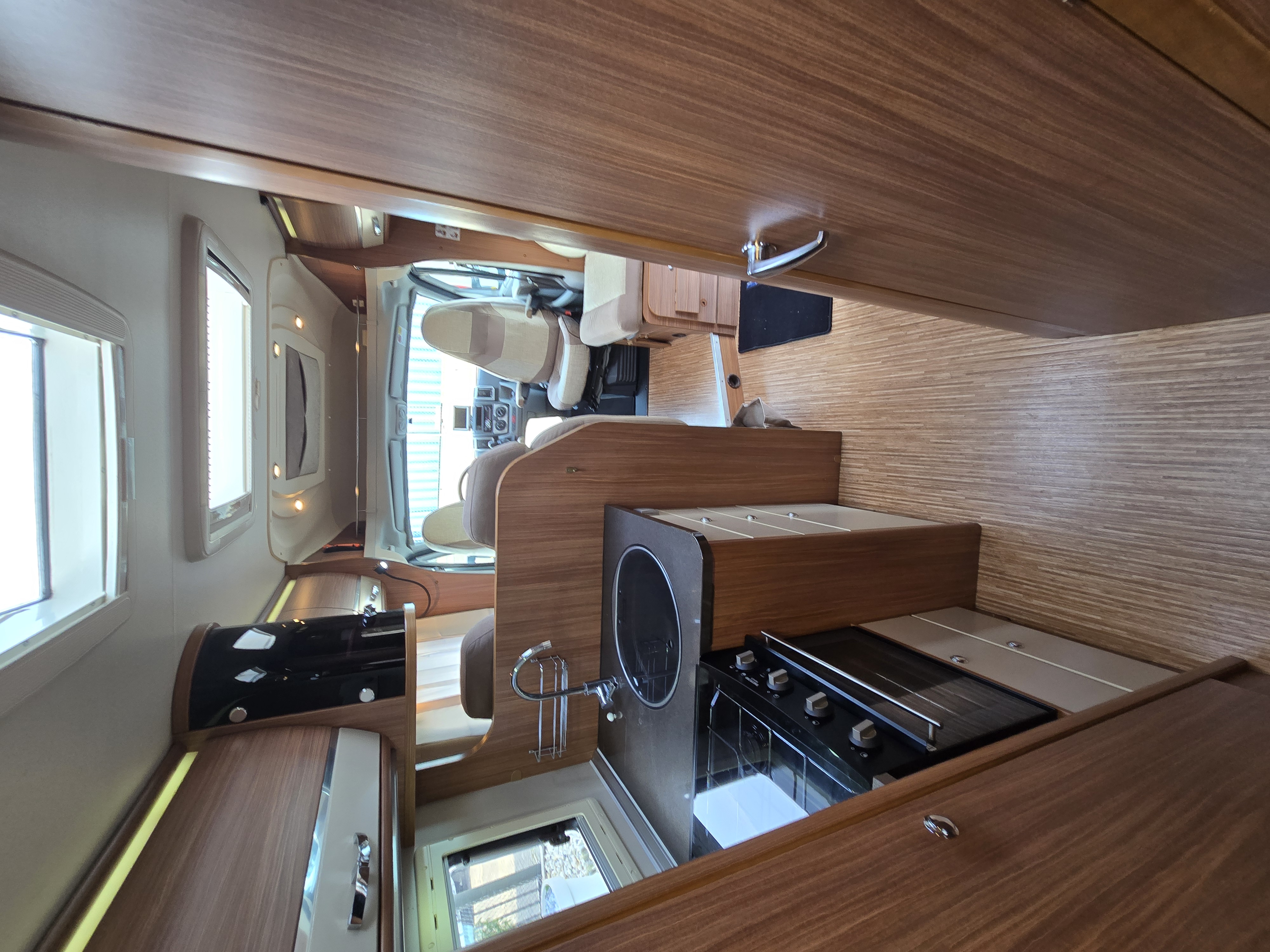 De handige standaardzit biedt niet alleen de nodige ruimte om te zitten, maar kan ook als slaapgelegenheid worden gebruikt. Adria Mobil heeft de luxe uitgevoerde keuken van deze camper voorzien van een afzuigkap, voor de afvoer van kookluchtjes en overtollige warmte, en van een oven, zodat u s ochtends verse broodjes op tafel heeft. Een ingebouwde boiler voorziet u van warm water. Om uw etenswaren op te bergen is er een koelkast met vriescompartiment ingebouwd.