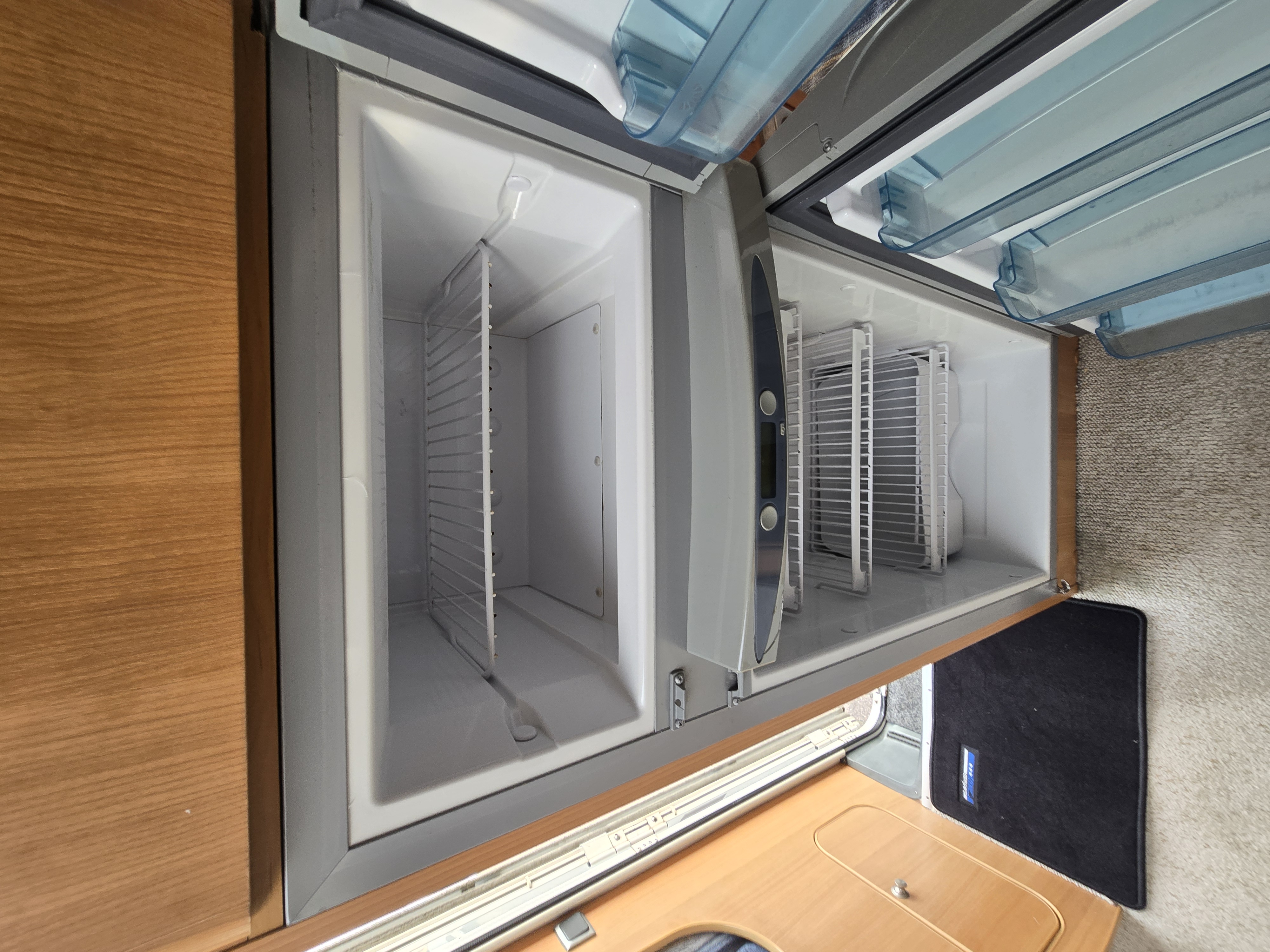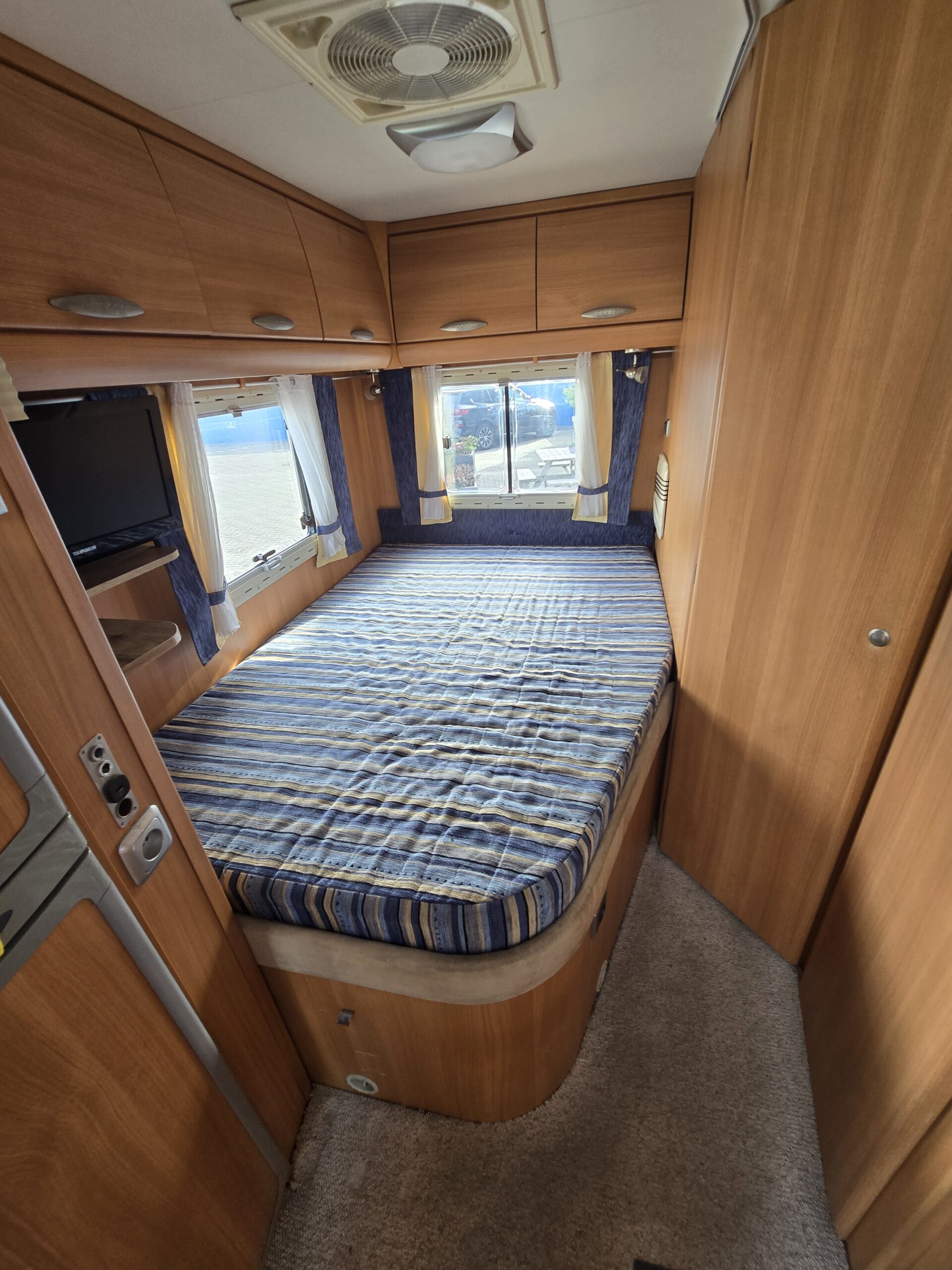 De camper is uitgerust met een Frans bed, een in de lengte geplaatst tweepersoons bed. Dankzij de traagschuimmatrassen en lattenbodems kunt u genieten van extra comfortabele bedden.