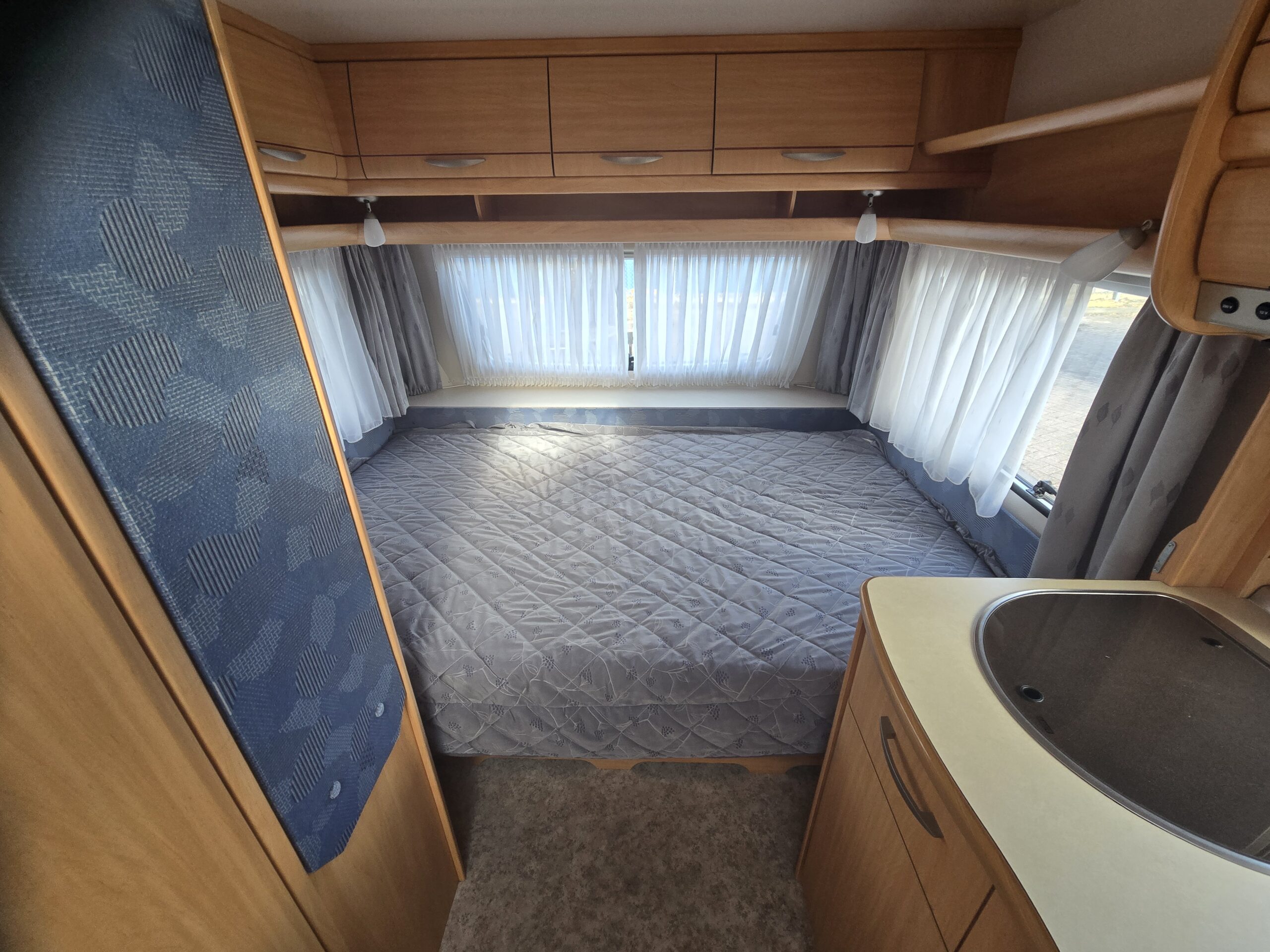 Het royale tweepersoons bed is dwars in de caravan geplaatst. Om u van een welverdiende nachtrust te laten genieten, hebben de bedden niet alleen lattenbodems, maar ook schuimmatrassen.