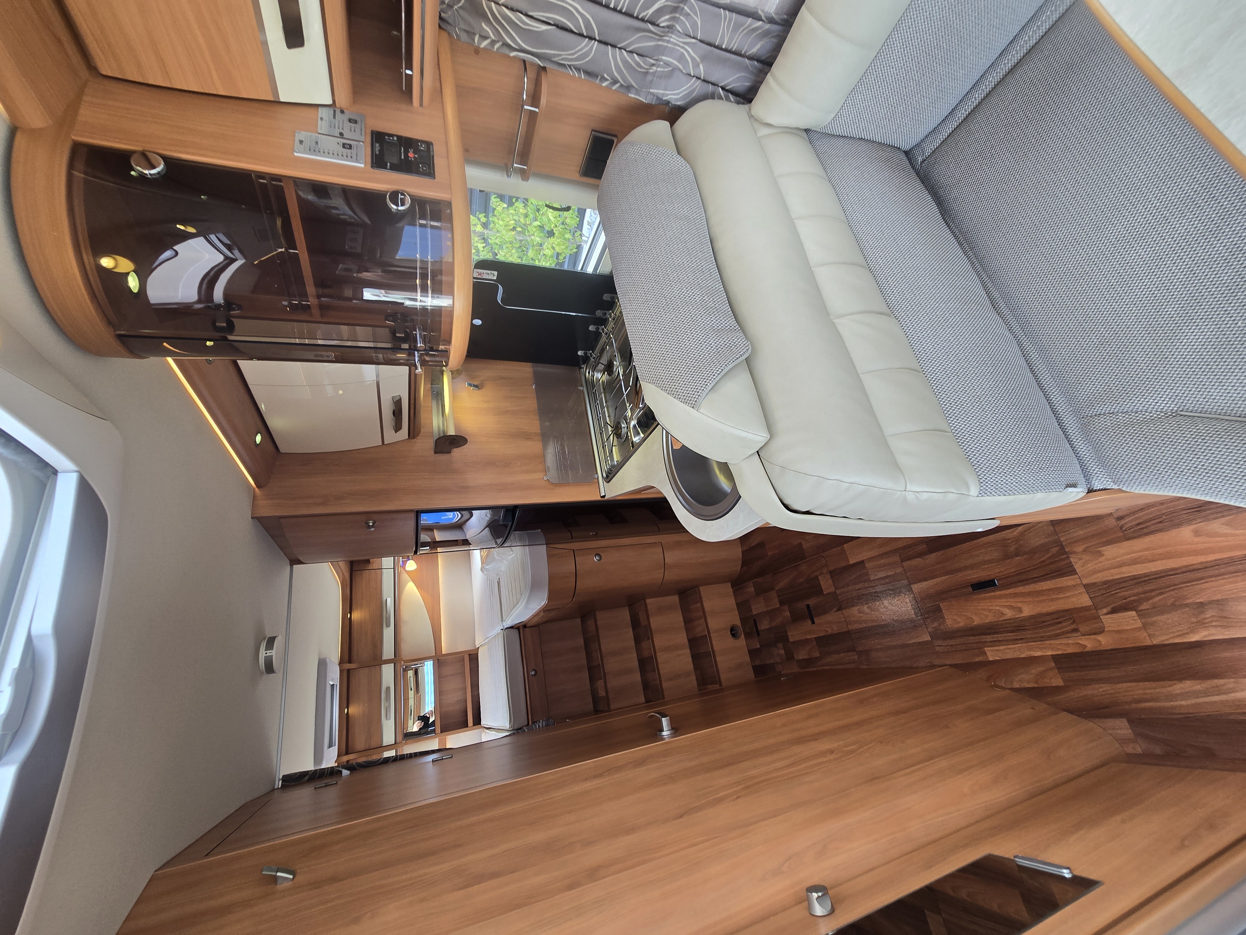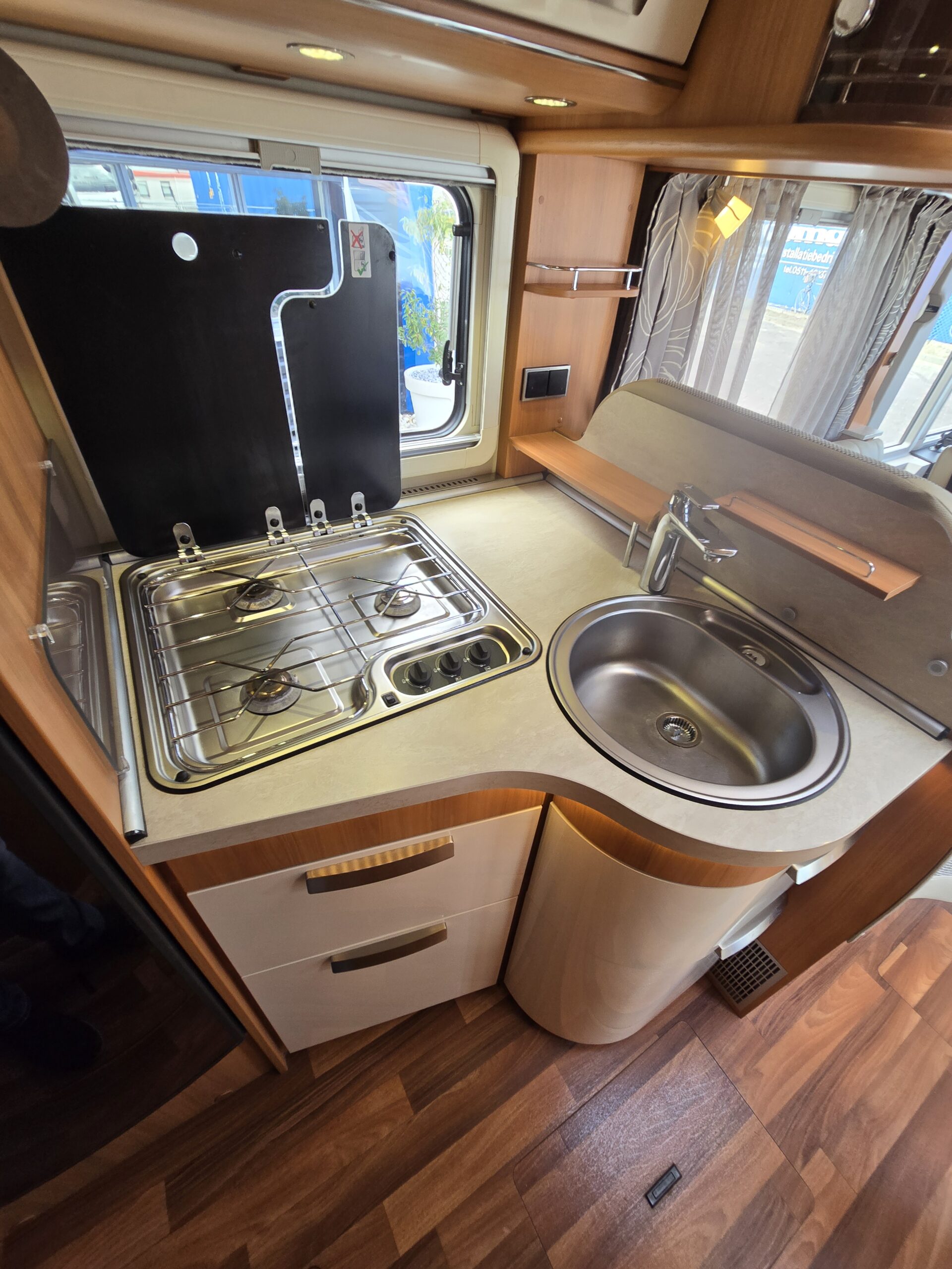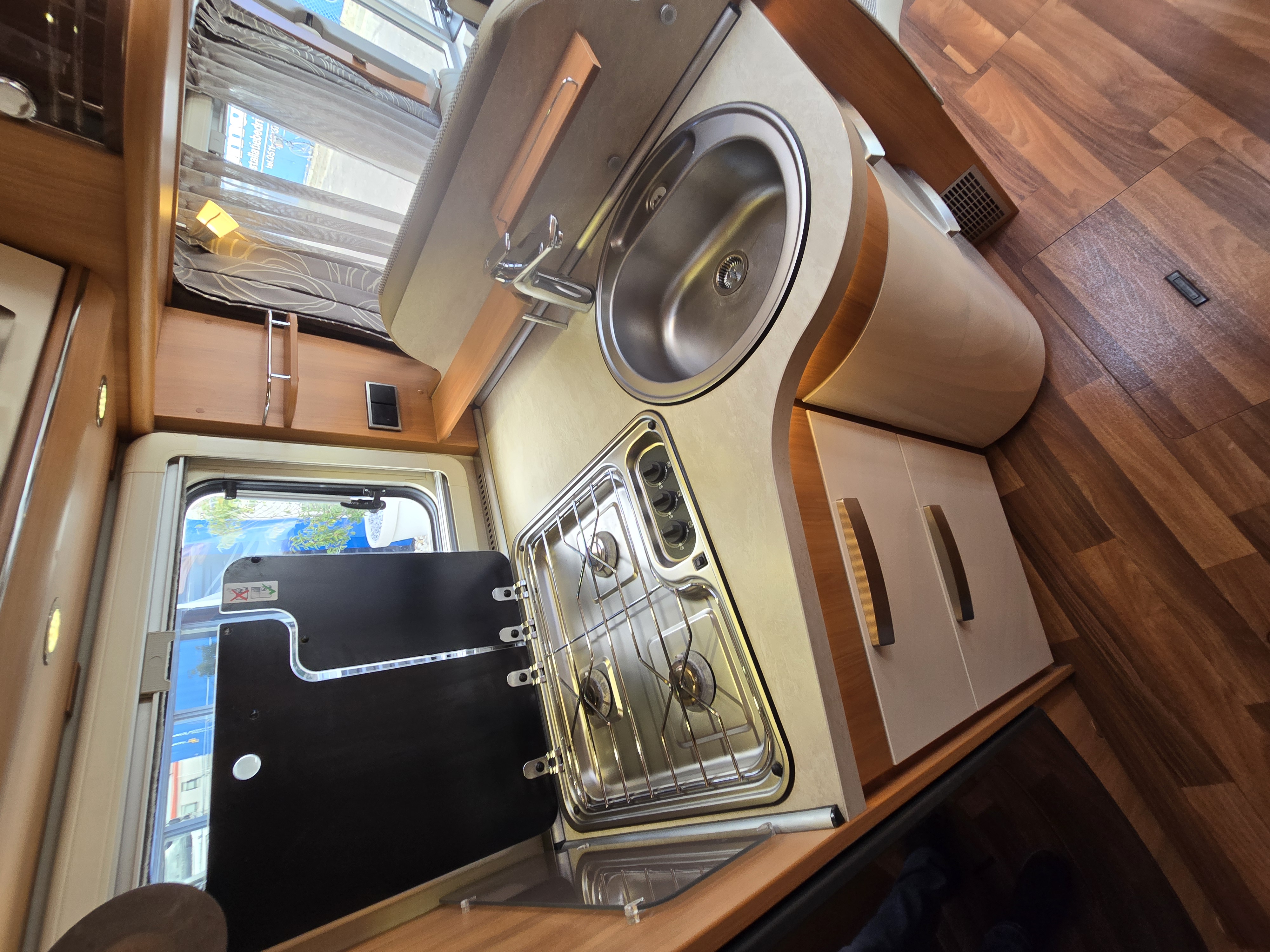 U kunt gezellig plaatsnemen in de praktische standaardzit, die ook kan worden omgebouwd tot slaapplaats. De keuken is in het midden van de camper geplaatst en beschikt over een 3-pits kooktoestel en gootsteen met kraan. Een ingebouwde boiler voorziet u van warm water. De koelkast met vriescompartiment is ruim genoeg voor al uw etenswaren.
