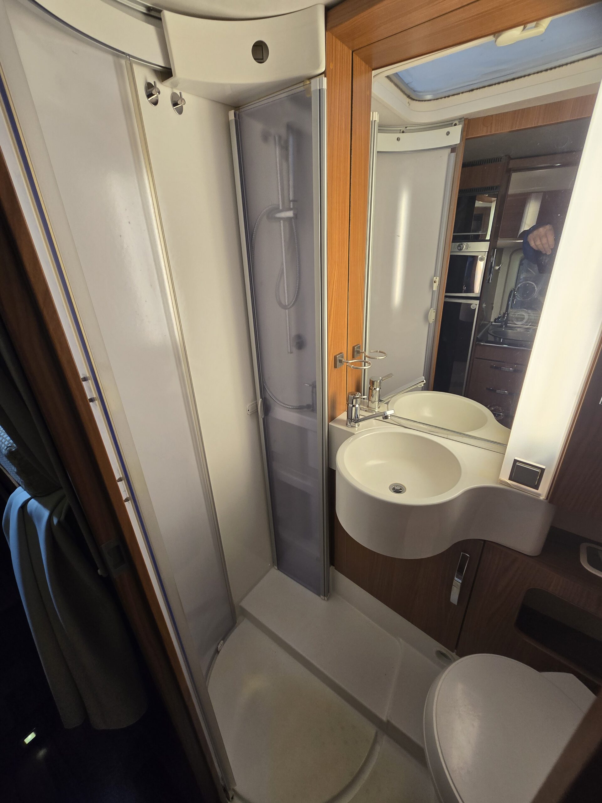 Het hefbed bespaart enorm veel ruimte en biedt plaats aan 2 personen. Slapen doet u op de 2 aparte bedden, die borg staan voor extra ruimte en een makkelijke instap. Aan slaapcomfort zal het u in deze camper, die is voorzien van lattenbodems en traagschuimmatrassen, zeker niet ontbreken. Naast het slaapgedeelte bevindt zich ook de douchegelegenheid met toilet