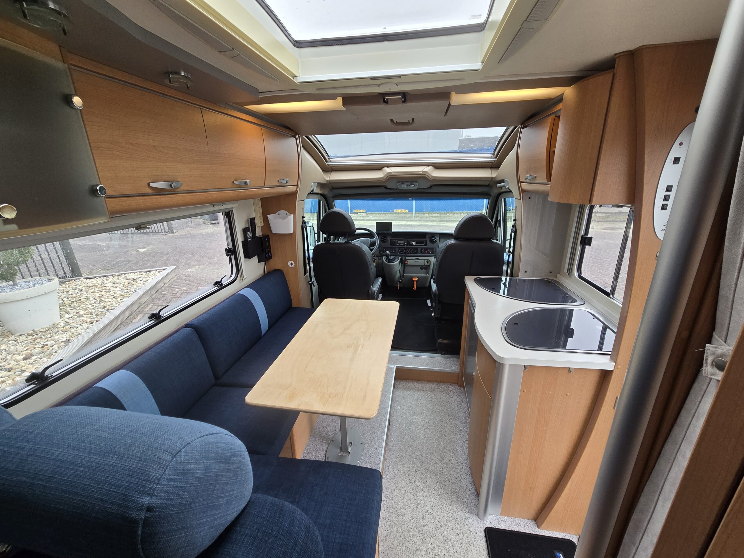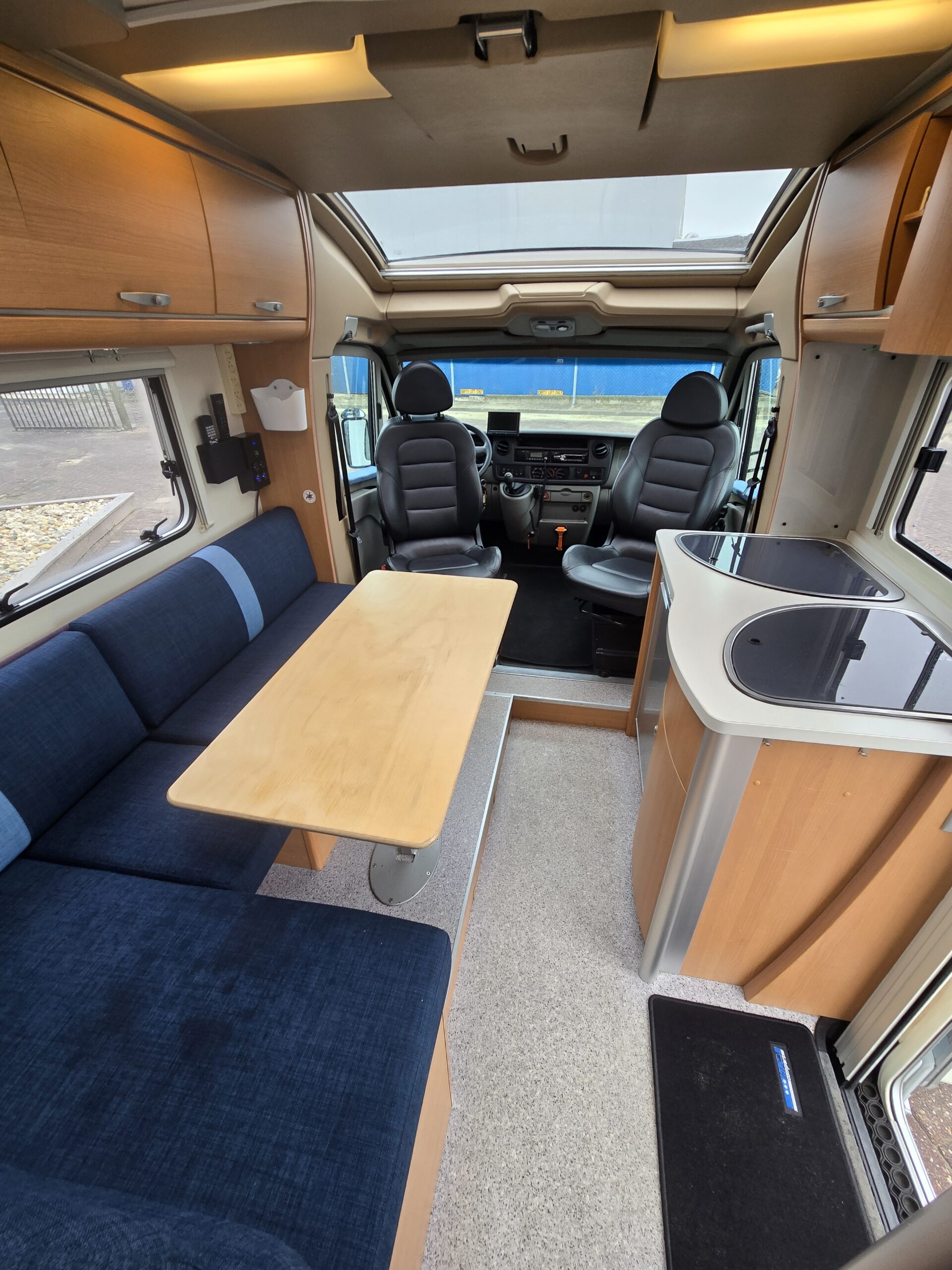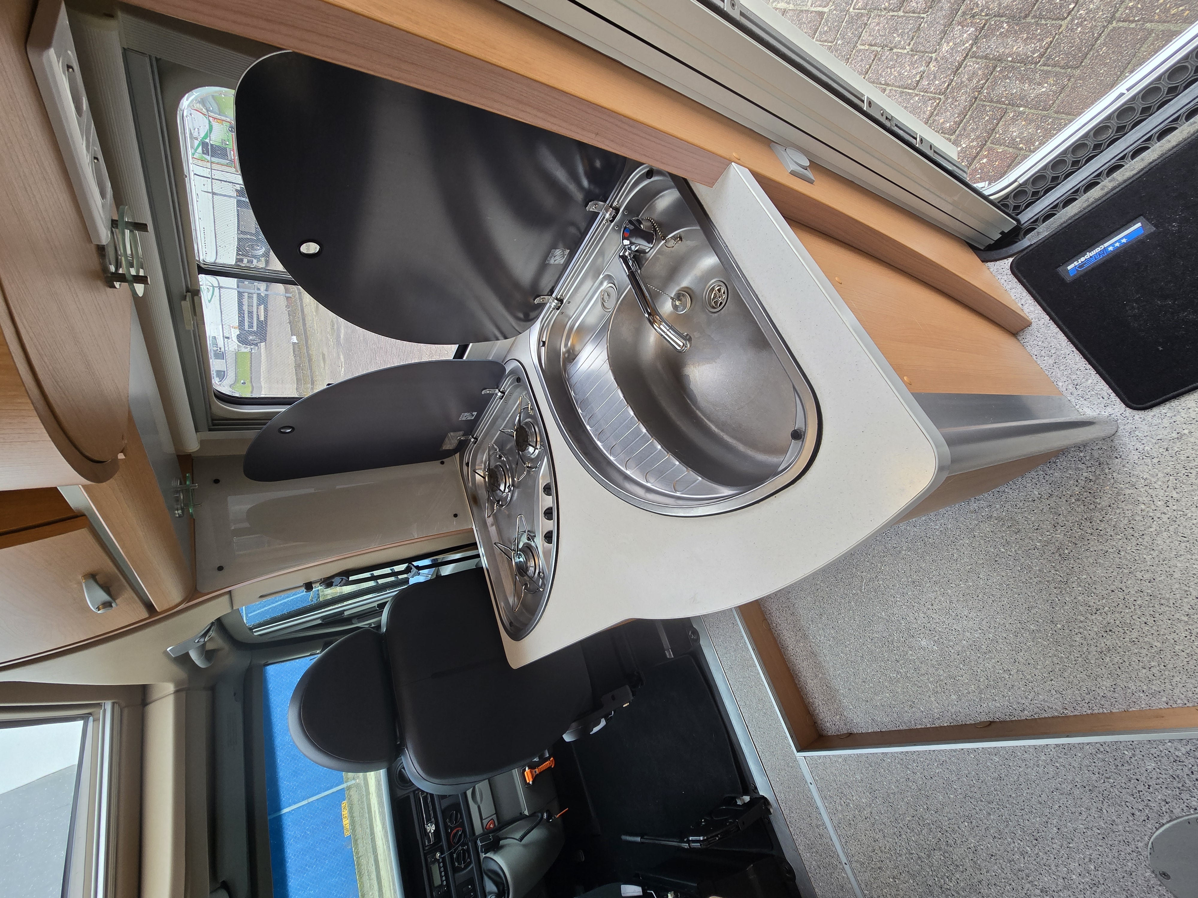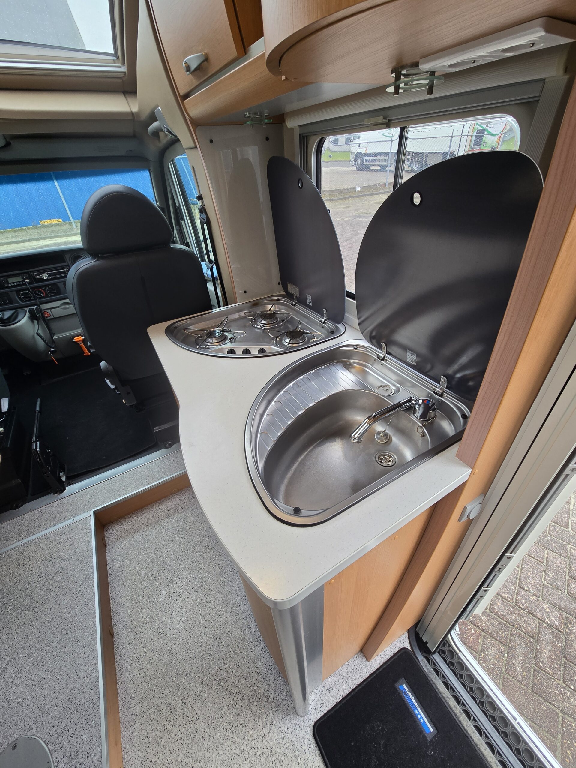 De standaardzit biedt niet alleen de nodige zitgelegenheid, maar kan ook worden omgebouwd tot slaapplaats. De keuken is in het midden van de camper gemonteerd en beschikt onder meer over een 3-pits kooktoestel en gootsteen met kraan. Een ingebouwde boiler voorziet u van warm water. De koelkast met vriesvak biedt voldoende ruimte voor heel uw voorraad.