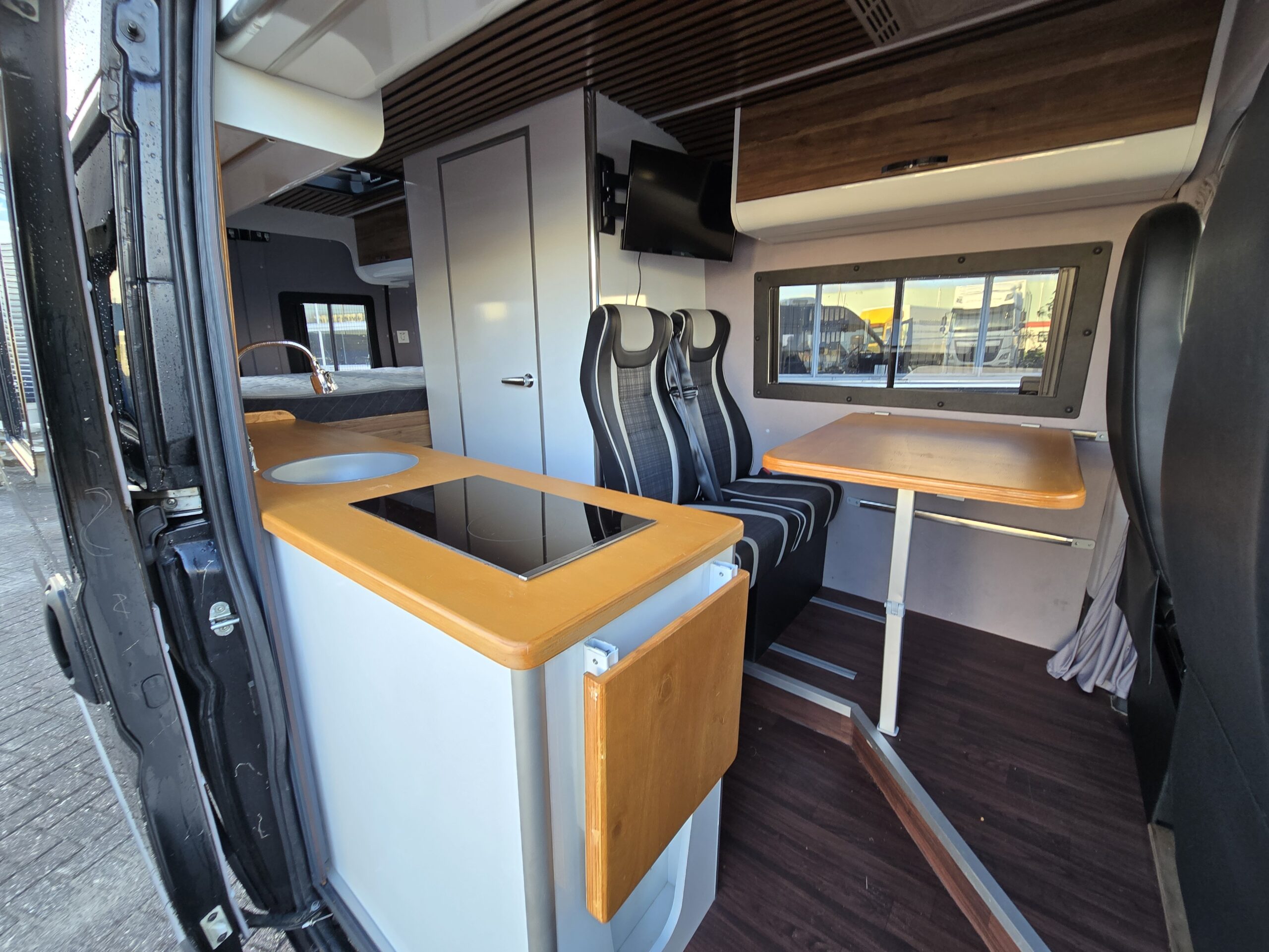 De keuken is in het midden van de camper gemonteerd en beschikt onder meer over een 2-pits kooktoestel (elektrisch) en gootsteen met kraan. De boiler, die in de camper is ingebouwd, voorziet u snel van warm water. De koelkast met vriescompartiment is ruim genoeg voor al uw etenswaren.